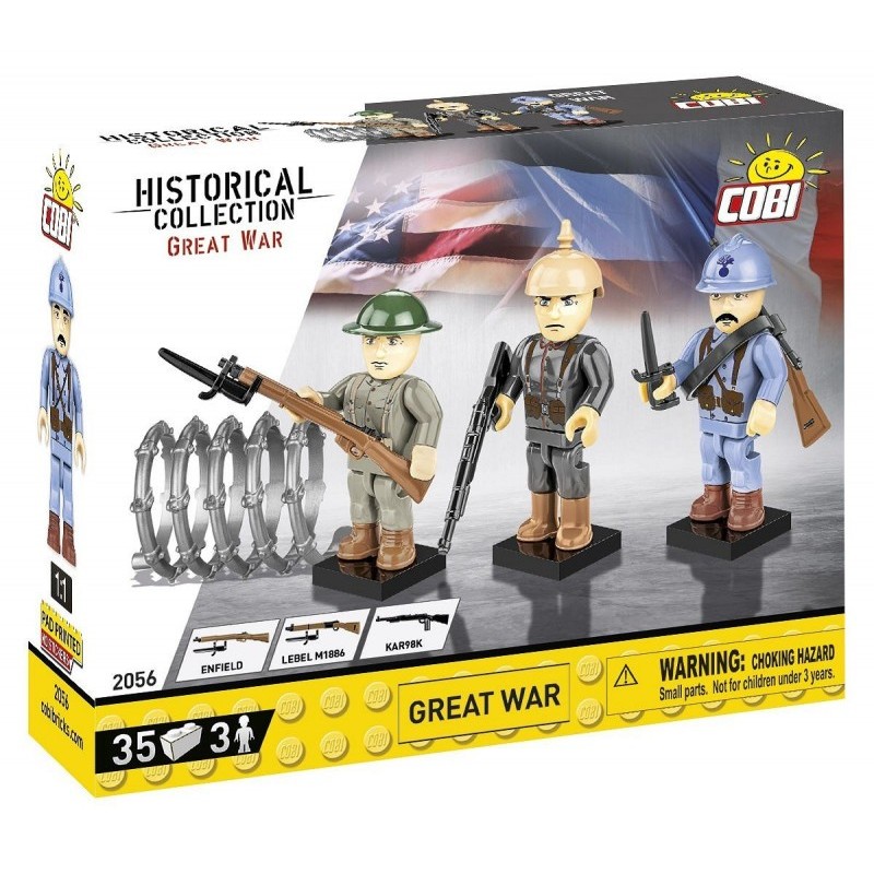 W 35 elementowym zestawie znajdują się trzy figurki przedstawiające żołnierzy z frontu zachodniego Wielkiej Wojny. Żołnierz w niebieskim mundurze to francuz wyposażony w karabin Lebel Mle 1886 oraz bagnet, który można również założyć na karabin. Na jego hełmie znajduje się nadruk. Żołnierz brytyjski wyposażony jest w dwukolorowy karabin Lee-enfield z bagnetem. Żołnierz niemiecki został wyposażony w karabin Mauser oraz charakterystyczny hełm pikelhauba w pokrowcu. Posiada on również wysokie buty marszowe w kolorze brązowym. W zestawie znajduje się fragment powszechnego w czasie wielkiej wojny drutu kolczastego.
