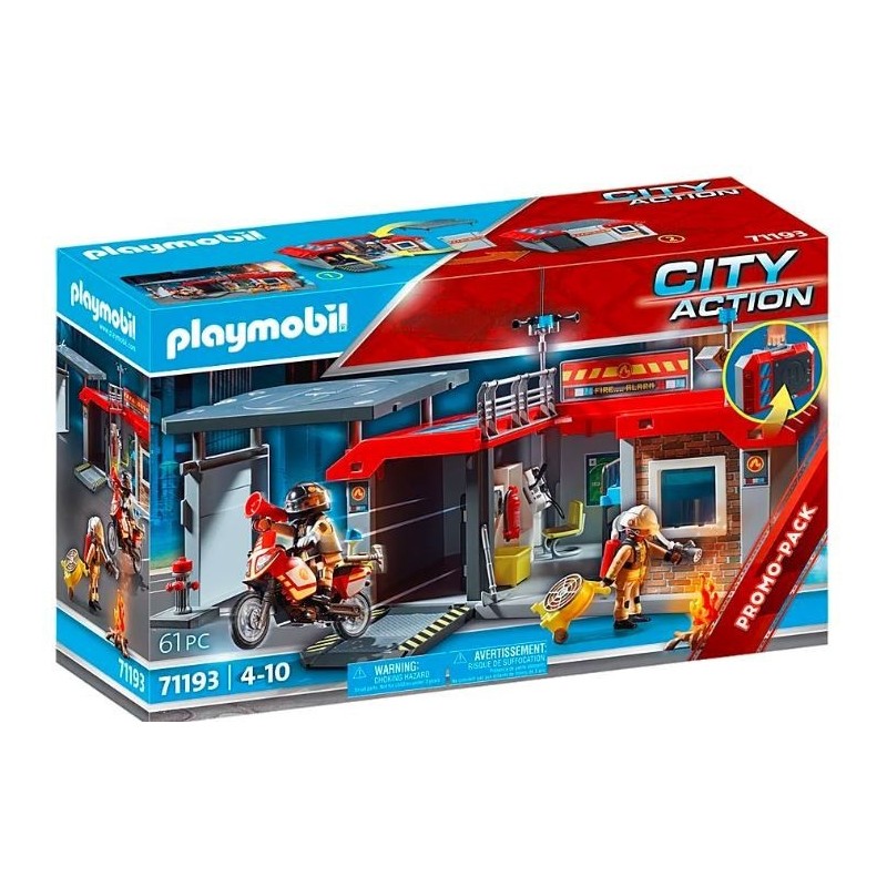 Alarm w remizie strażackiej! Zestaw można poskładać i zabrać ze sobą jako walizeczkę. Przemień przednią, szarą płytę na miejsce do lądowania dla helikopterów lub garaż oraz ułóż ścianki na nowo. W zestawie motocykl i wiele akcesoriów.