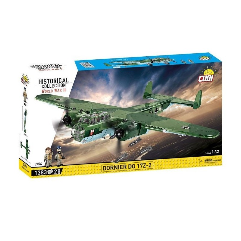 Model słynnego bombowca Dornier DO 17 został starannie opracowany przy użyciu 1383 klocków konstrukcyjnych w rewelacyjnej dużej skali 1:32. Rozpiętość skrzydeł tego ogromnego modelu wynosi aż 57,5 cm! W zestawie zastosowano tylko i wyłącznie trwałe nadruki. Nie znajdziesz tutaj naklejek! Dla lepszego odwzorowania skomplikowanego kształtu kabiny pilotów oraz nosa samolotu opracowaliśmy zupełnie nowe wzory klocków w technice dwukolorowego wtrysku! W kokpicie zawierającym również nadruki aparatury mieszczą się dwie figurki pilotów. Zestaw zawiera ruchome elementy takie jak śmigła, lotki i zamykane luki bombowe. Pod skrzydłami znajdują się dodatkowe nadruki oraz odczepiane bomby i koła. Spodnia część samolotu została zbudowana z klocków w zupełnie nowym odcieniu koloru niebieskiego. Dołączone do zestawu dwie figurki pilotów w starannie odwzorowanych uniformach posiadają nadruki na plecach. W komplecie znajduje się tabliczka z nazwą zestawu. Ten samolot to pozycja obowiązkowa dla wszystkich fanów historii, lotnictwa, militariów i techniki wojskowej. Uzupełnij swoją kolekcję i buduj historię klocek po klocku!