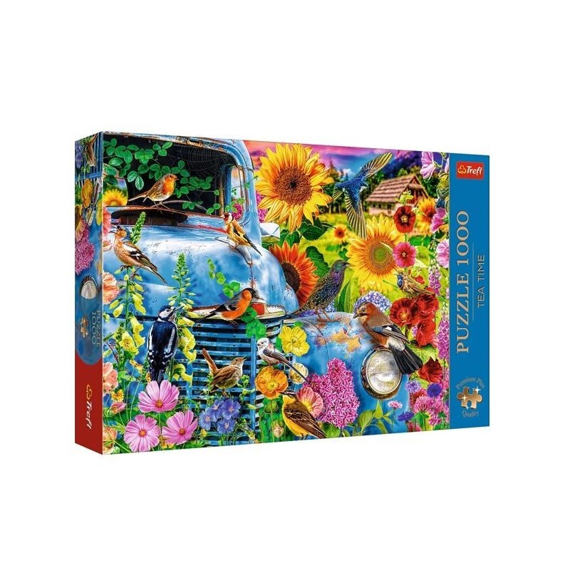 Puzzle Wiejska sielanka: Śpiewające Ptaki przedstawiają stare auto w otoczeniu ptaków oraz kwiatów. Po ich ułożeniu powstanie obraz o wymiarach 683x480 mm.