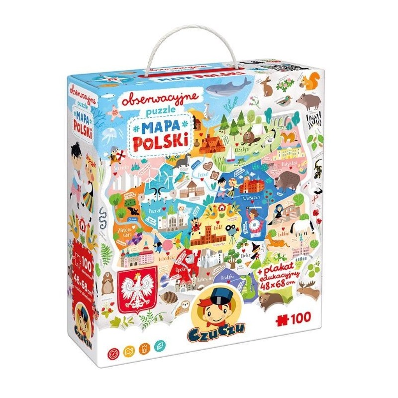 Znasz ciekawego świata przedszkolaka, który interesuje się wieloma tematami i zadaje mnóstwo pytań? Dziecko w tym wieku jak gąbka chłonie nową wiedzę, co w naturalny sposób przychodzi mu przez zabawę. Dlatego podsuń mu edukacyjne zabawki, które zaspokoją naturalną ciekawość świata zapraszamy na edukacyjną wycieczkę palcem po mapie! 100-elementowe Obserwacyjne puzzle Mapa Polski to doskonały pomysł na mądry prezent. Oprócz pięknej układanki z ramką do wyszukiwania detali (ha, ćwiczymy bystre oko!), w zestawie znajdziecie plakat pełen informacji o ciekawych miejscach w kraju.