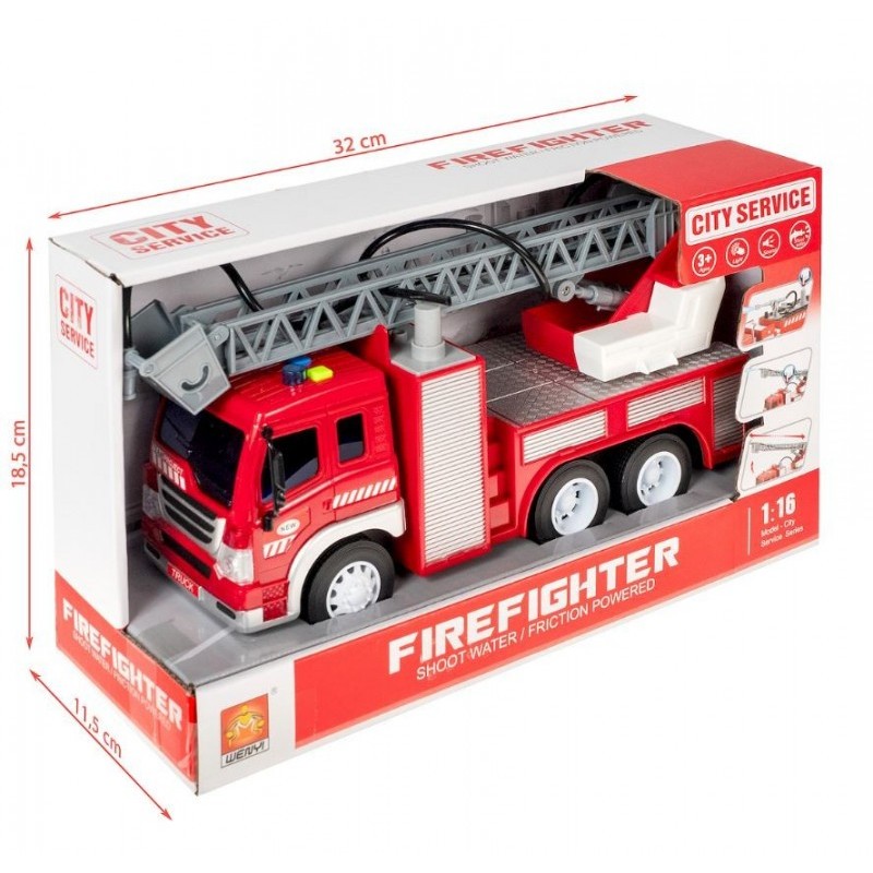 Pojazd posiada funkcje dźwiękowe i świetlne - wóz wydaje z siebie dźwięk syreny alarmowej i rozbłyska niebieskim światłem. Włącz syrenę i ruszaj do akcji. Wyposażony w rozkładaną drabinę z koszem oraz sikawkę do wody. nabierz wody i gaś prawdziwe pożary.